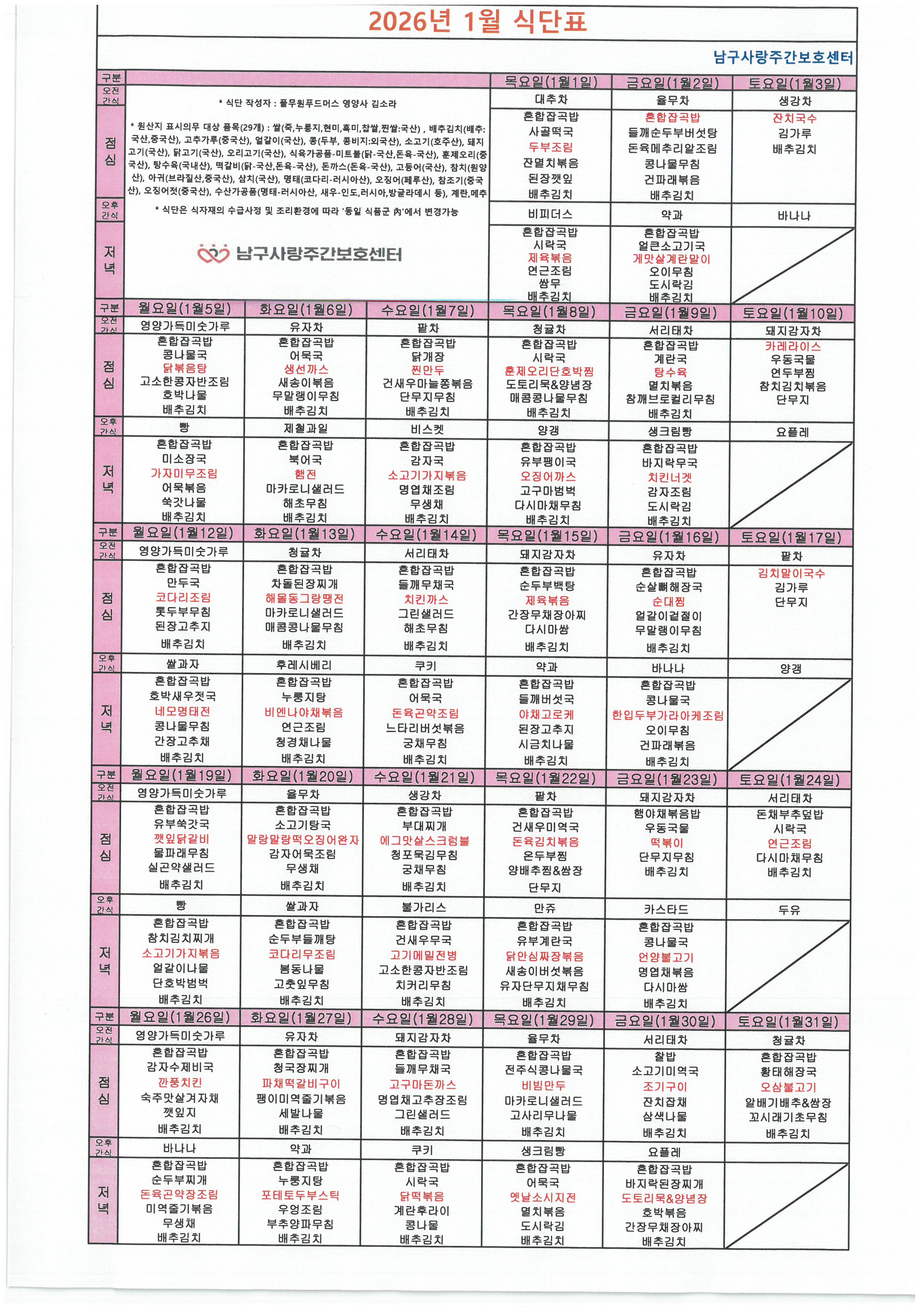 2026년 1월 식단표입니다.