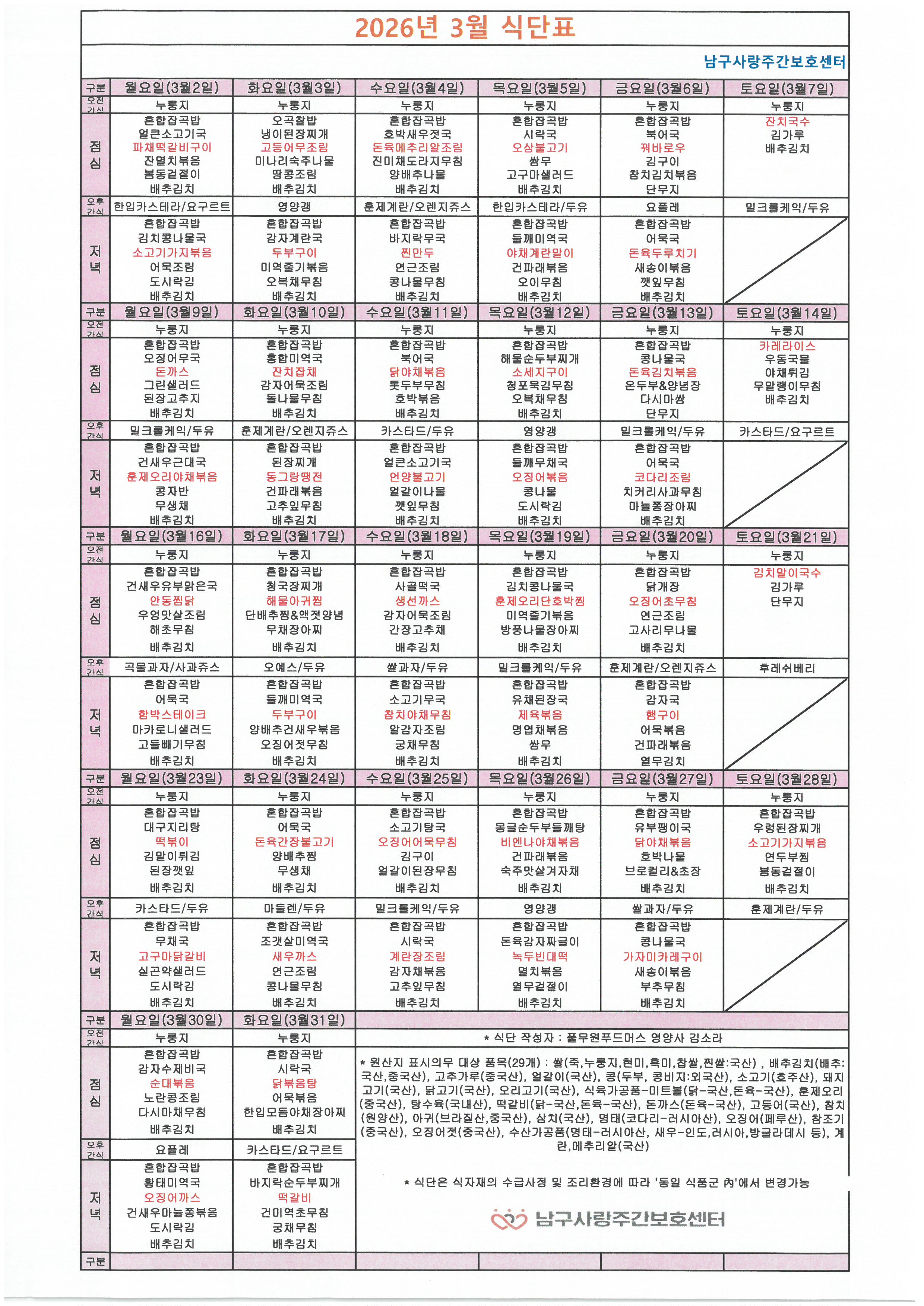2026년 3월 식단표입니다.